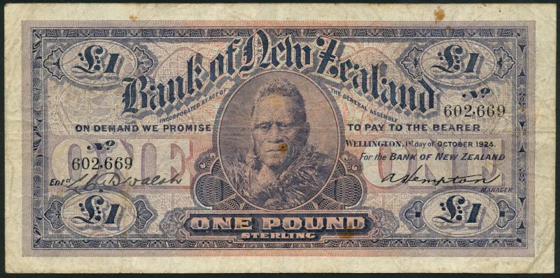 Bank of New Zealand, £1, 1 October 1924, serial number 602669, violet and pink, the Maori King Tawhiao at centre, one manuscript and one printed signature