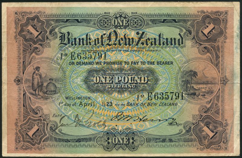 Bank of New Zealand, £1, 1 April 1923, serial number E 635791, green, blue, orange and purple, Maoris at left, pastoral scene at right, one manuscript and one printed signature below, reverse multicoloured, arms at centre, 'No.7 ISSUE' low centre