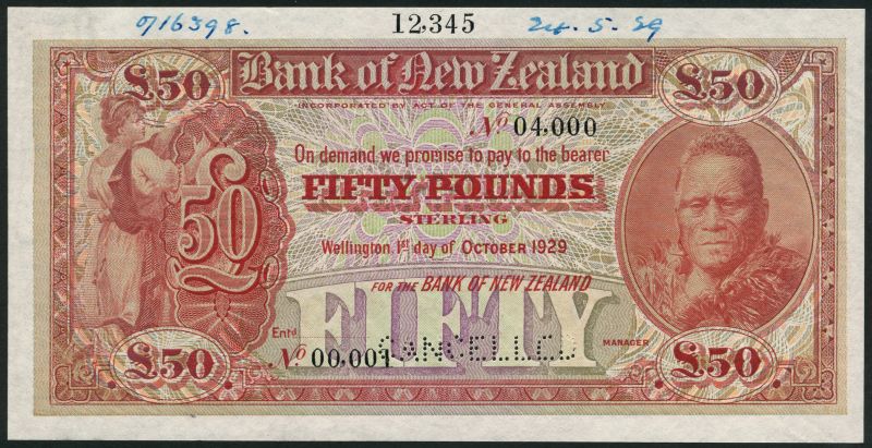 (†) Bank of New Zealand, specimen £50, Wellington, 1 October 1929, serial number 00001-04000, red and multicoloured, the Maori King Tawhiao at left, maiden at right, no signature, reverse red and multicoloured, arms at centre, Maoris at left and landscape at right
