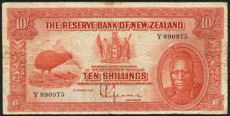 (x) Reserve Bank of New Zealand, 10 Shillings, 1 August 1934, serial number Y 890975, red on multicoloured underprint, King Tawhiao at right, kiwi at left, arms at upper centre, reverse Mitre Peak