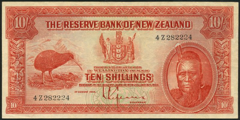 Reserve Bank of New Zealand, £1, 1 August 1934, serial number in red 2B 874713, violet and pale green and pink, the Maori King Tawhiao at right, Kiwi bird at left, arms at centre and 10 shillings, 1 August 1934, serial number 4Z 282224, red and pale green and pink, both Lefeaux signature