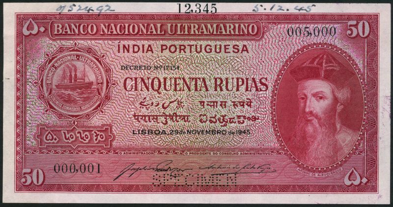 (†) Banco Nacional Ultramarino, Portuguese India, specimen 50 rupias (2), 29 November 1945, serial number 000001-050000,005001-010000, red and lilac, Afonso de Albuquerque at right, ship seal at left, first Viegas and Pinto Coelho second Viegas and Machado signatures, reverse blue-green and lilac, maiden and shiping through the ages, arms top right
