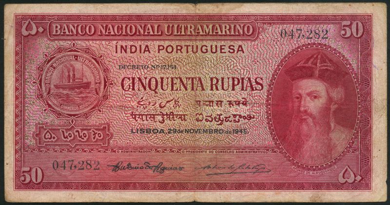 (x) Banco Nacional Ultramarino, Portuguese India, 50 rupias, 29 November 1945, serial number 047282, dark red and lilac, De Albuquerque at right, ship seal at top left, reverse red, maiden and ships at left, value and arms at right