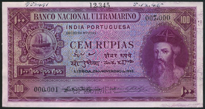 (†) Banco Nacional Ultramarino, Portuguese India, specimen 100 rupias (2), 29 November 1945, serial number 000001-007000,007001-013000, violet and lilac, Afonso de Albuquerque at right, ship seal at left, Viegas and De Aguiar, Viegas and Correia De Sa signatures respectively, reverse violet, maiden and shipping through the ages, arms top right
