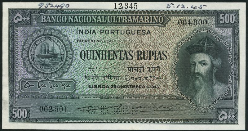 (†) Banco Nacional Ultramarino, Portuguese India, specimen 500 rupias (3), 29 November 1945, one with no serial numbers, balance serial number 001501-002500,002501-004000, dark green and lilac, Afonso de Albuquerque at right, ship seal at left, Pinto Coelho/Viegas signatures on the first two, Machado and Viegas on the last, reverse dark green and pale blue, maiden and shipping through the ages, arms top right