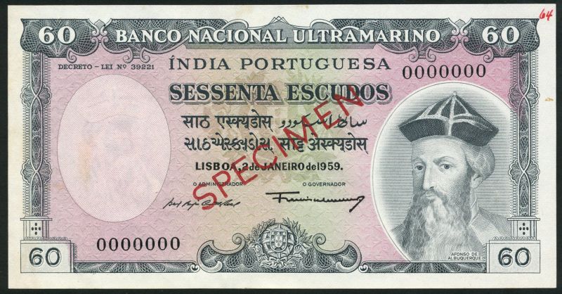 (x) Banco Nacional Ultramarino, Portuguese India, 60 Escudos, 2 January 1959, serial number 359351; specimen 60 Escudos, 2 January 1959, serial number 0000000, overprinted SPECIMEN in red on obverse and reverse, both black and multicoloured, Afonso de Albuquerque at right, reverse maiden looking at sailing ships