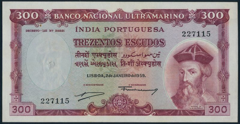 (x) Banco Nacional Ultramarino, Portuguese India, 300 Escudos, 2 January 1959, serial number 227115, violet and multicoloured, Afonso de Albuquerque at right, reverse maiden looking at sailing ships