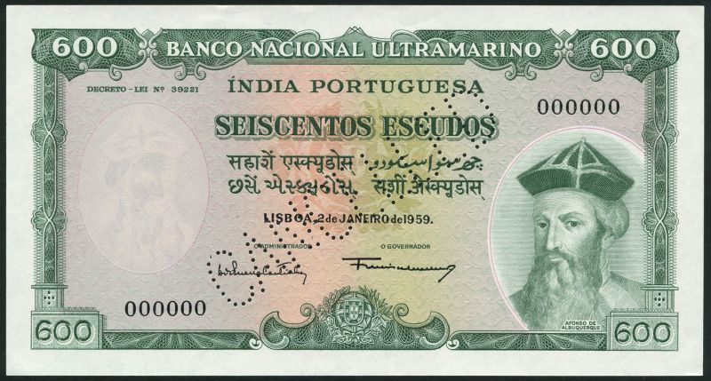 (†) Banco Nacional Ultramarino, Portuguese India, specimen 300 Escudos, 2 January 1959, violet and multicoloured and specimen 600 Escudos, 2 January 1959, green and multicoloured, both zero serial numbers, Afonso de Albuquerque at right, reverse maiden looking at sailing ships, perforated CANCELLED