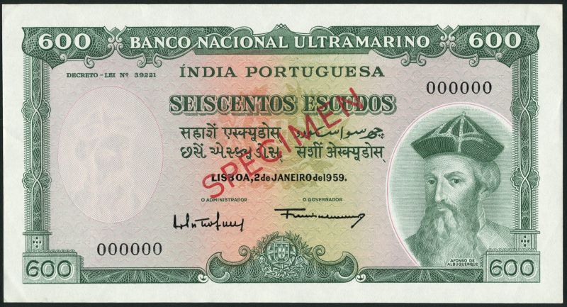 (†) Banco Nacional Ultramarino, Portuguese India, specimen 600 Escudos, 2 January 1959, green and multicoloured. zero serial numbers, Afonso de Albuquerque at right, reverse maiden looking at sailing ships, overprinted SPECIMEN in red on obverse and reverse