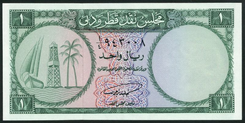 Qatar and Dubai Currency Board, 1 riyal, ND (1966), black serial numbers with prefix 1/4, green and multicoloured, dhow, derrick and palm trees at left, reverse green and lilac, value at centre