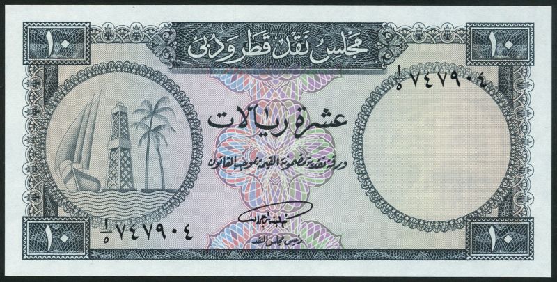Qatar and Dubai Currency Board, 10 riyals, ND (1966), black serial numbers, blue-grey and multicoloured, dhow, derrick and palm trees at left, reverse blue-grey, value at centre