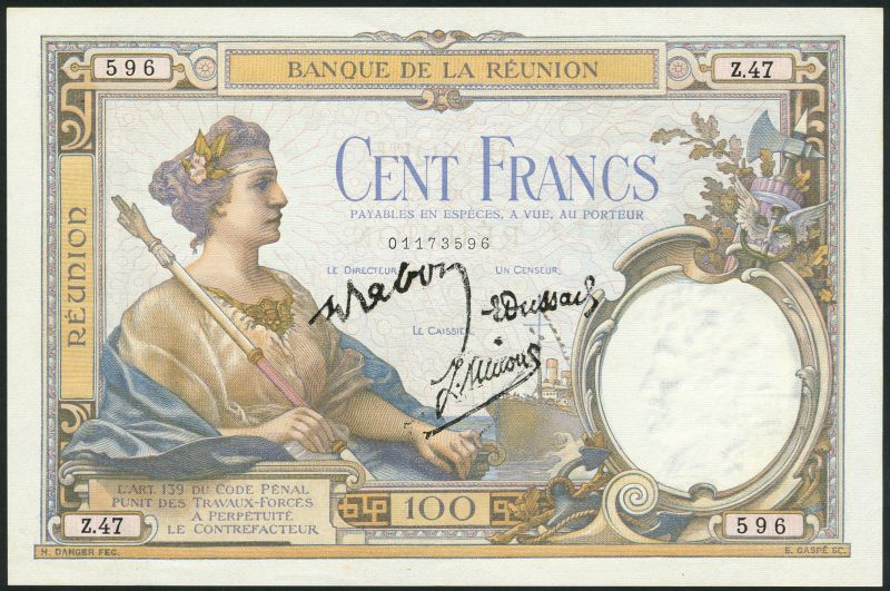 Banque de la Reunion, 100 francs, ND (1926-44), serial number Z.47 596, multicolour, woman with staff at left, ship at low right, caduceus and fasces at top right, value at low centre