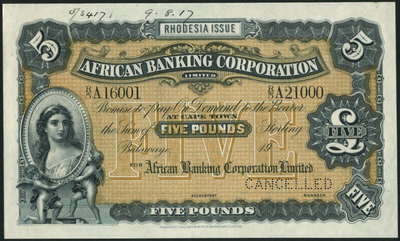 (†) African Banking Corporation Limited, specimen £5, Bulawayo, 19- (ca 1917), serial number R/5A16001-R/5A21000, black and brown, maiden in oval frame supported by cherubs low left, value at centre and at left and right, RHODESIA ISSUE in tablet top centre, reverse brown, map of Africa at centre, value at left and right
