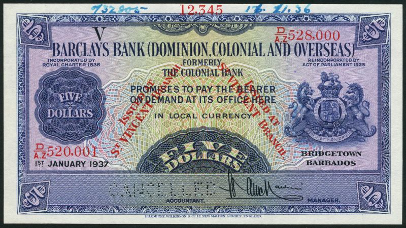 (†) Barclays Bank (Dominion, Colonial and Overseas), Saint Vincent, specimen $5, 1 January 1937, red serial number D/AZ 520001-D/AZ 528000, blue and multicoloured, arms at right, G top left, value at left, value at each corner, red ISSUED AT St. VINCENT BRANCH at left and right centre, reverse blue and blue-green, arms at centre, value at left and right