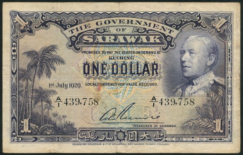 (x) Government of Sarawak, $1, 1 July 1929, serial number A/1 439758, purple and multicoloured, Charles Vyner Brooke at right, palm trees at left, reverse blue-violet, arms and value