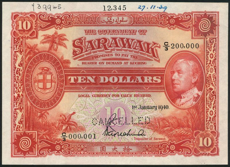 (†) Government of Sarawak, printer's archival specimen 10 Dollars, 1 January 1940, serial number run C/3 000,001 to C/3 200,000, scarlet-red and multicoloured, Sir Charles Vyner Brooke at right, palm trees at left, reverse Government House at centre, value in guilloches at right and left, perforated CANCELLED