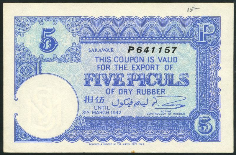 Sarawak rubber coupons, 5,10,25(2) katis, 1 and 5 piculs, 1941-1942, Johore, 10 and 25 katis and 1 picul, also Federated Malay States 10 katis and 1 picul, all 1941