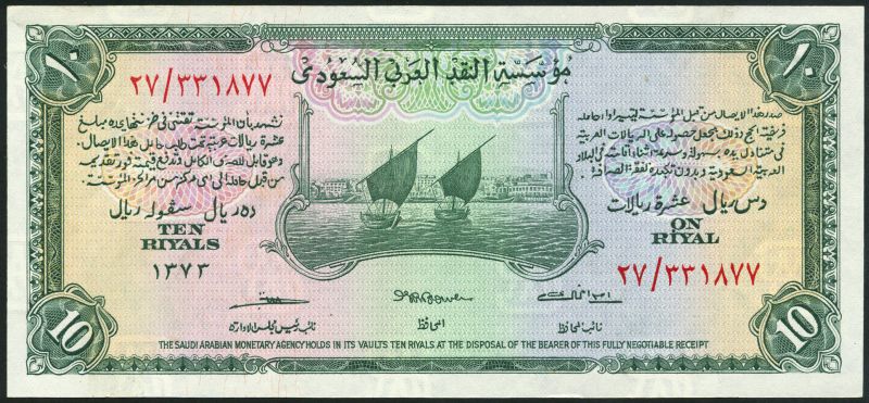 Saudi Arabian Monetary Agency, Haj Pilgrim Receipt Issues 10 Riyals, AH 1373 (1954), green and multicoloured, two dhows in Jeddah harbour at upper centre, reverse, palm trees above crossed swords at left and right