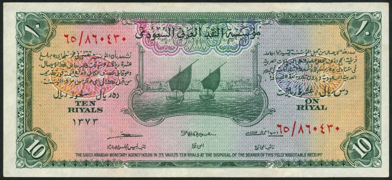 Saudi Arabian Monetary Agency, Haj Pilgrim Receipt Issues 10 Riyals, AH 1373 (1954), green and multicoloured, two dhows in Jeddah harbour at upper centre, reverse, palm trees above crossed swords at left and right