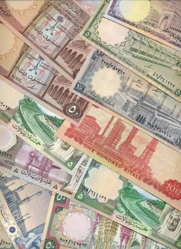 Saudi Arabian Monetary Agency, a set of the Law of AH1379 (1968) issue comprising 1 Riyal, purple; 5 Riyals, green; 10 Riyals, grey; 50 Riyals (2), brown; 100 Riyals, red; also a set of the Law of AH1379 (1977) issue all with King Faisal at right comprising 1 Riyal, red-brown; 5 Riyals (2), green, incorrect and corrected text; 10 Riyals, lilac; 50 Riyals, green and purple; 100 Riyals (2), blue and purple