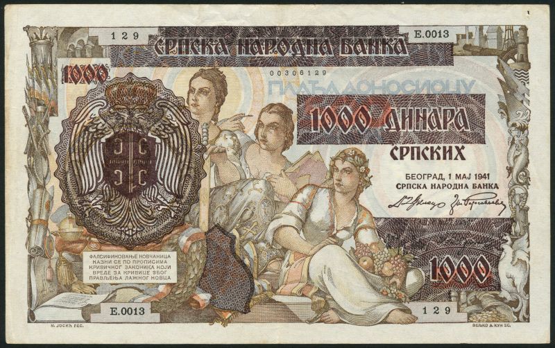 Serbian National Bank, 50 dinara, 1941, 100 dinara, 1941, purple, 1000 dinara, 1941, multicoloured, both with overprint, 500 dinara (2), 1941, 1000 dinara, 1942, Kingdom of Yugoslavia, 50 dinara, 1931, 1000 dinara, 1931, multicoloured, Queen Marie at left, also another example with VERIFICATO handstamp at left and right, 20,40 and 80 kruna overprint notes,