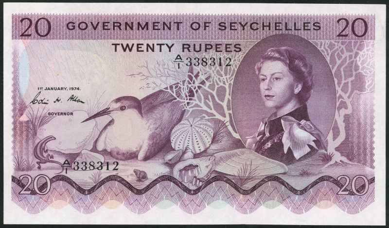 (x) Government Issue, Seychelles, 20 rupees, 1 January 1974, serial number A/1 338312 purple, skink lizard and Sooty Tern left centre, Elizabeth II at right, Colin Hamilton Allan signature, reverse purple and lilac
