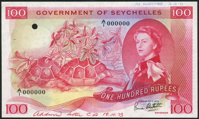 (†) Government issue, Seychelles, specimen 100 rupees, 1 August 1973, serial number A/1 000000, red and multicoloured, Elizabeth II at right, turtles left centre, reverse red and pale blue