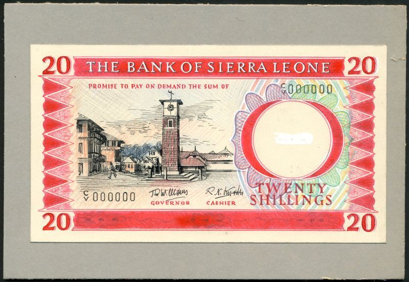 (†) Bank of Sierra Leone, an obverse and reverse composite essay on card for an unissued 20 Leones, ND (ca 1980), serial number C/V 000000, carmine red and multicoloured, clock tower in Freetown at left, reverse mine, elevator and waggons