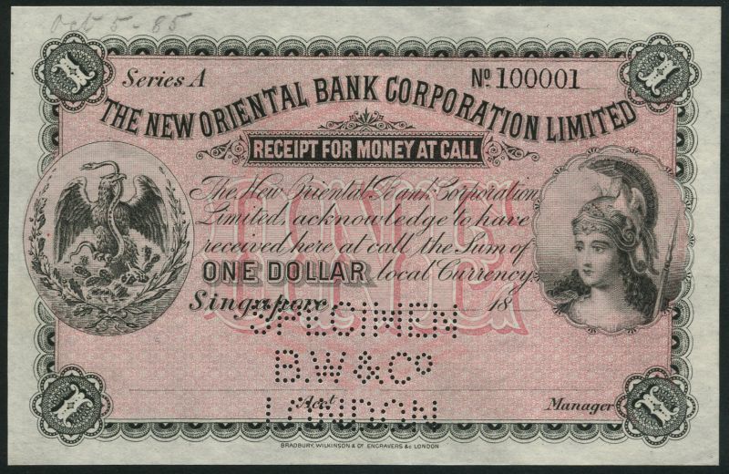 (†) The New Oriental Bank Corporation Limited, specimen $1, Singapore, 18- (ca 1885), serial number A 100001, black and pink, head of Minerva at right, eagle and serpent at left (the arms of Mexico), value at centre and at each corner, reverse red and white central design of man with parasol and horse