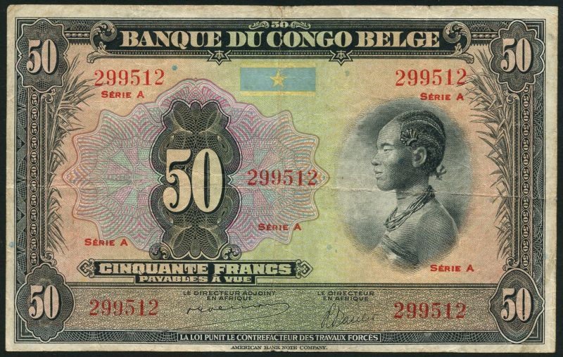 Banque du Congo-Belge, 50 francs, ND 91941), red serie A, black and multicoloured, girl at right, reverse black, leopard