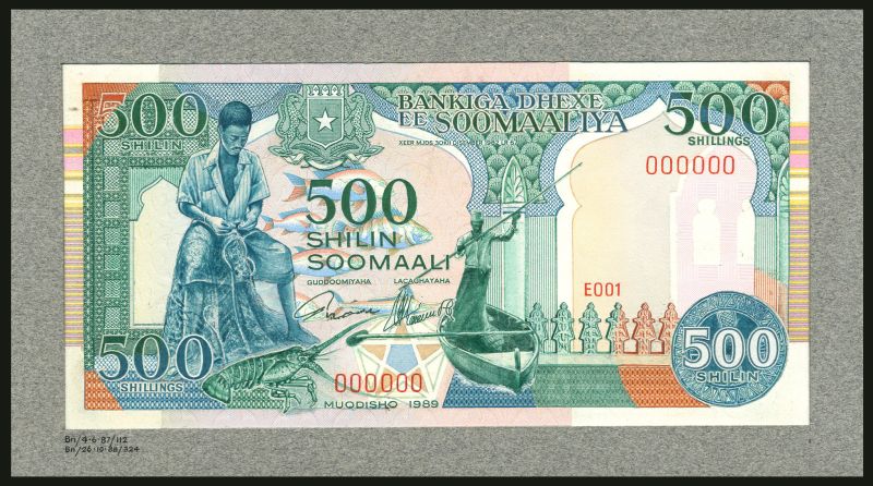 (†) Central Bank of Somalia, an obverse and reverse composite essay on card for issued 500 Shillin = 500/-, 1989, red serial number E001 000000, green and aqua on multicoloured underprint, fisherman mending net at left, man paddling boat at lower centre, reverse mosque