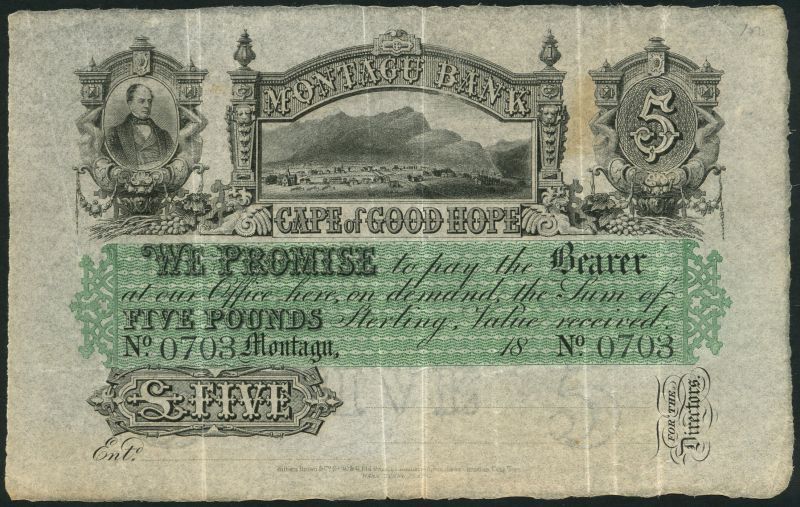 Montagu Bank, Cape of Good Hope, a part issued 5 pounds, Montagu, 18- (1861-1862), serial number 0703, black and white with a green central panel, Montagu (?) top left, town and mountains top centre
