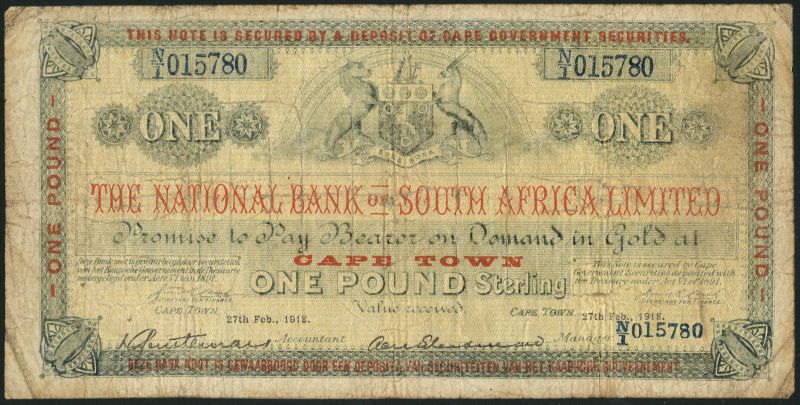 The National Bank of South Africa Limited, £1, Cape Town, 27 February 1918, blue serial number N/1 015780, blue and pale orange, bank title and value in red, arms top centre, two handstamped signatures below, value in field and at each corner, CAPE TOWN in red at centre, reverse black and white, value at centre