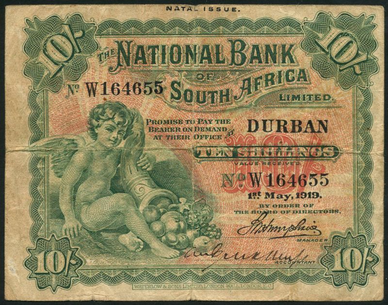 The National Bank of South Africa Limited, 10 shillings, Durban, 1 May 1919, serial number W 164655, green and pale red and pale orange-yellow, cherub with corncopia at low left, two printed signatures low right, DURBAN in field right centre, NATAL ISSUE in top margin, reverse blue, antelope head at centre, value at left and right