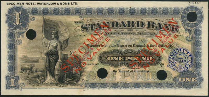 Standard Bank of South Africa Limited, colour trial £1, ND (ca 1918), no serial numbers, purple and pale pink-orange, Britannia at left with allegorical symbols of prosperity, value right centre and at each corner, reverse purple, turreted female head at centre, value at left and right