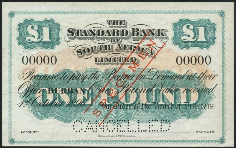 Standard Bank of South Africa limited, specimen £1, Durban, 1 October 1896, serial number 00000, black text on green and white, value low centre and top left and right, reverse brown central panel with value