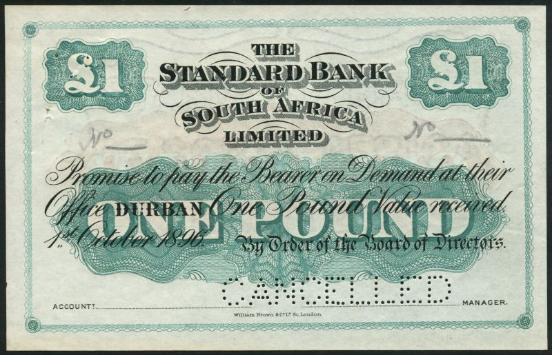 Standard Bank of South Africa limited, proof £1, Durban, 1 October 1896, no serial numbers, black text on green and white, value low centre and top left and right, reverse brown central panel with value