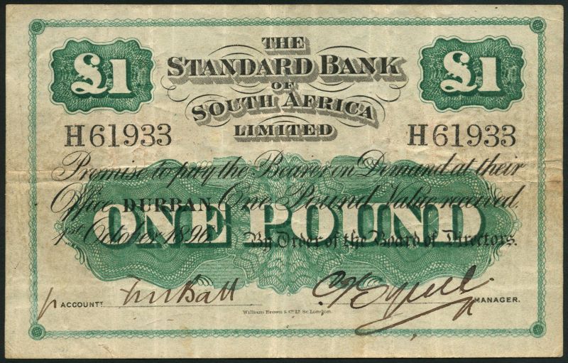 Standard Bank of South Africa limited, £1, Durban, 1 October 1896, serial number H61933, black text on green and white, value low centre and top left and right, two manuscript signatures below, reverse brown central panel with value