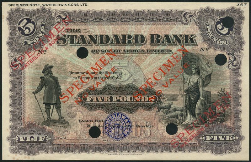 Standard Bank of South Africa Limited, colour trial £5, ND (ca 1918), no serial numbers, purple and pale blue, Britannia at right with allegorical symbols of prosperity, a statue of Van Riebeeck at left, manuscript signature low left, printed signature low right, reverse red, turreted female head at centre, bank offices at left and right