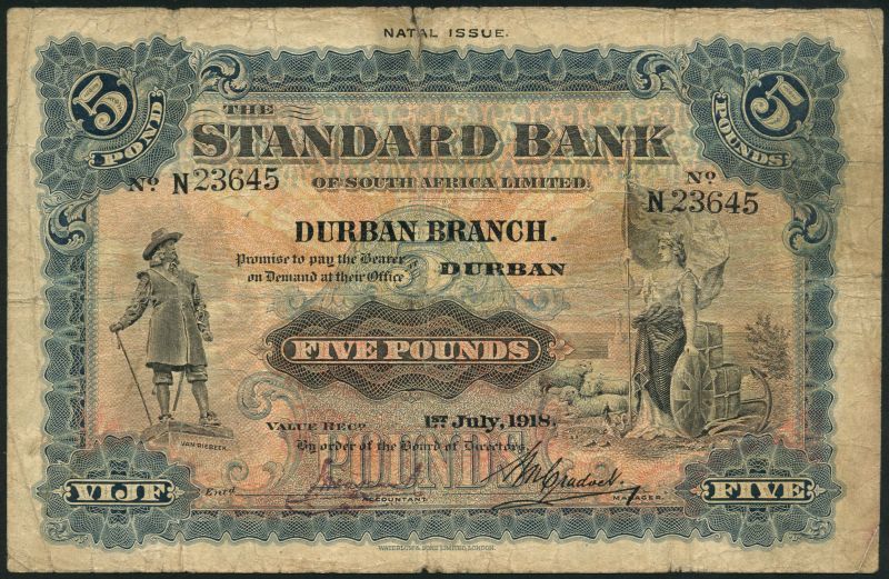 Standard Bank of South Africa Limited, £5, Durban, 1 July 1918, serial number N23645, blue and pale red and orange, Britannia at right with allegorical symbols of prosperity, a statue of Van Riebeeck at left, manuscript signature low left, printed signature low right, NATAL ISSUE in top margin, reverse blue, turreted female head at centre, bank offices at left and right