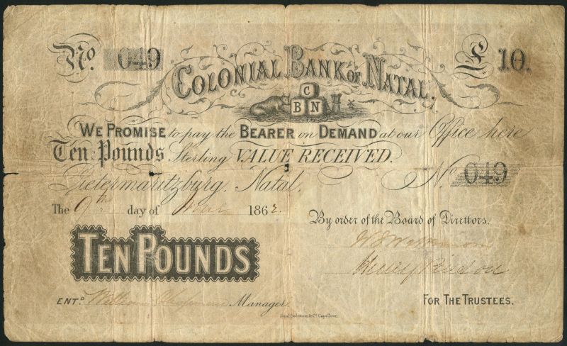 Colonial Bank of Natal, South Africa, £10, Pietermaritzburg, 9 June 1862, serial number 049, black and white, agricultural symbols flanking bales with bank initials, CBN, top centre, value in black tablet low left, three manuscript signatures below
