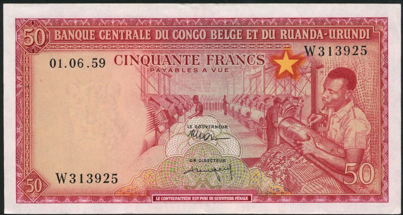 Banque Centrale du Congo-Belge et du Ruanda-Urundi, 20 francs (3), 1 December 1960, serial number AZ 420919/920/921, green and white and yellow, boy at left, reservoir at right, reverse green and pink, girl at right, falls and fisherman left centre, also a 50 francs, 1 June 1959, red and multicoloured, man engraving at right