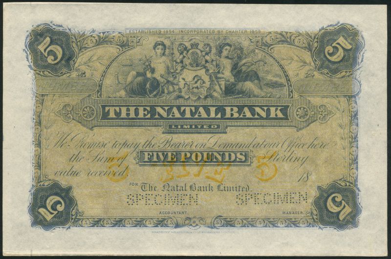 The Natal Bank Limited, a specimen £5, 18- (ca 1890's), plue and beige with value in orange low centre, allegorical maidens flanking arms top centre, value at centre and at each corner, reverse blue and white, bank title and value