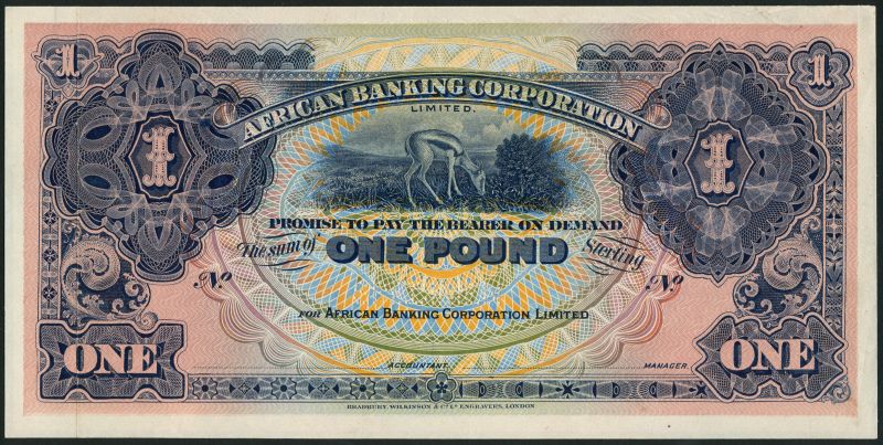 African Banking Corporation, proof £1 on card, ND (ca 1918), no place name, blue and multicoloured, springbok grazing top centre, value at centre and at left and right, reverse brown and pale blue, map of Africa at centre, value at left and right