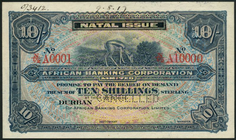 African Banking Corporation, Natal issue, specimen 10 shillings, Durban, ND (ca 1917), red serial number N/1/2 A0001-N1/2 A10000, blue and multicoloured, springbok top centre, value low centre and at each corner, reverse blue, pale red and green, map of Africa at centre, value at left and right