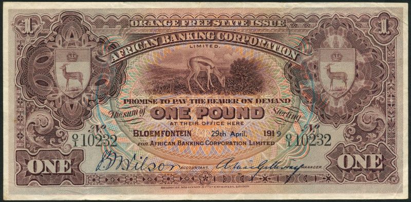 African Banking Corporation, £1, Bloemfontein, 29 April 1919, serial number O/1 10232, purple and multicoloured, springbok grazing top centre, arms top left and right, value at centre and at left and right, two manuscript signatures below, reverse blue and pale orange, map of Africa at centre, value at left and right