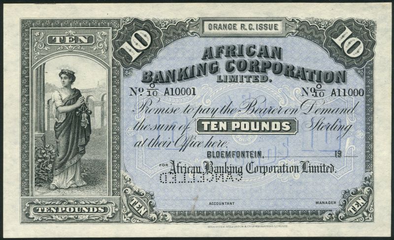 African Banking Corporation Limited, specimen £10, Bloemfontein, 19- (ca 1900), serial number O/10 A10001-O/10 A11000, blue and black and white, allegorical maiden at left with scientific instrument at left, value in field, ORANGE R.C.ISSUE in panel top centre, reverse blue, map of Africa at centre, value at left and right