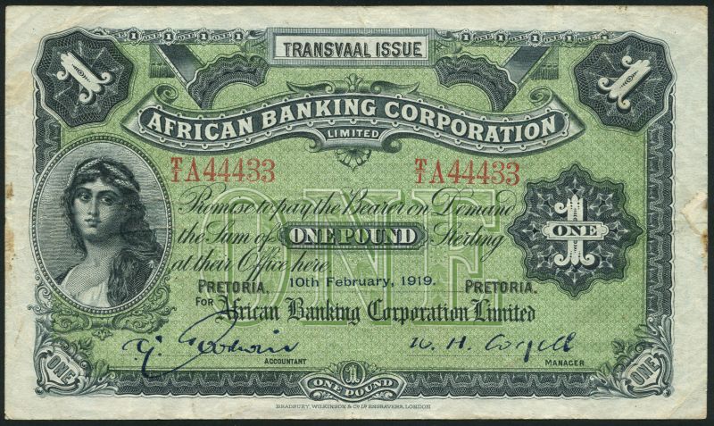 African Banking Corporation, Transvaal issue, £1, Pretoria, 10 February 1919, red serial number T/1 A44433, green and black, head of a maiden (Ceres) at left, value at right, value at each corner, two manuscript signatures below, green, map of Africa at centre, value at left and right