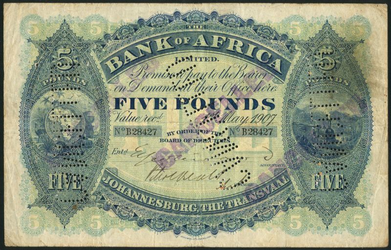 Bank of Africa, £5, Johannesburg, Transvaal, 1 May 1907, serial number B28427, blue and pale blue-green, map of Africa at left, locomotive at right, two manuscript signatures below, reverse orange-brown, value in field