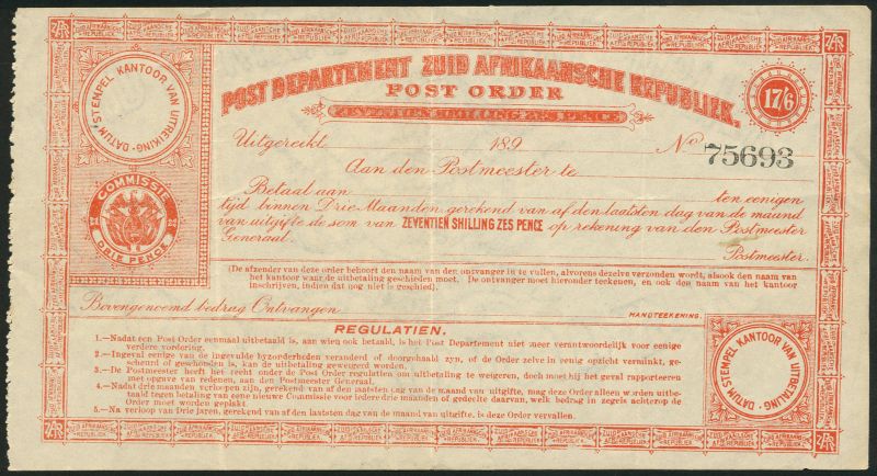 Post Department Zuid Afrikaansche Republik, part issued 10/-, 189-, blue and white, 17/6, red-orange and white and 20/-, violet and white, arms at left, value top right